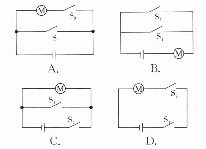 11. 某智能扫地机器人,有手动和语音两种开关模式。无论手动触摸按钮(相当于闭合开关 $ S_1 $),还是语音发出指令(相当于闭合开关 $ S_2 $),电动机 $ M $ 都开始工作,扫地机器人进入打扫模式。下图设计的电路中符合上述要求的是(