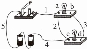 短路 2 1或4 [导线2直接接在两个灯泡两端,闭合开关后,等于是导线直接接在电源两端,会发生短路现象;若要使两灯串联,应去掉导线2;若要两灯并联,应将导线1或者导线4 改接到b接线柱。]