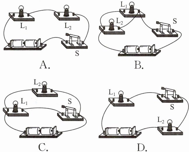 10. 如图所示电路中,开关能够同时控制两盏灯,且两灯发光情况互不影响的电路是(