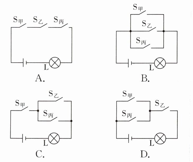 4. 中国举重队在杭州亚运会上取得了优异成绩。在举重比赛中有甲、乙、丙三个裁判,其中甲为主裁判,乙和丙为副裁判,若裁判认定杠铃已被举起,就按一下自己前面的按钮(相当于一个开关)。比赛规则:主裁判和至少一个副裁判都按下自己前面的按钮时,指示杠铃被举起的灯泡L才亮,表示举重成功。图中符合这一要求的电路是(