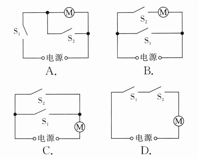 3. (河北石家庄期中)一款电动车智能头盔,戴上头盔扣上卡扣后,头盔上的信号发射器发出信号,当电动车上的信号接收器$S_{1}$接收到信号后,再转动电动机车钥匙$S_{2}$,车才能正常启动。下列电路符合设计要求的是(