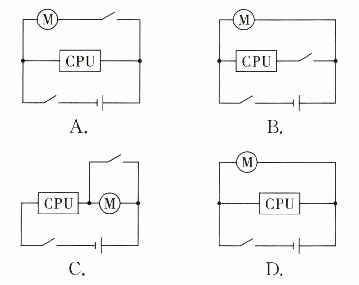 2. 电脑正常工作时,中央处理器(即CPU)不断发热必须用风扇给其降温。为了保证中央处理器不被烧坏,要求:中央处理器CPU工作之前,带动风扇的电动机要先启动;中央处理器断电后,电动机仍能继续工作进行散热。下列四个电路图中符合要求的是(