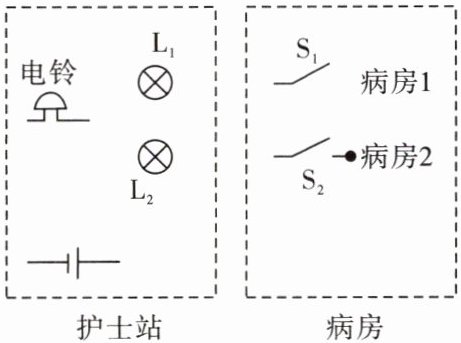 11. (湖南邵阳期中)设计一个病床呼叫电路。要求:开关$S_{1}控制指示灯L_{1}$和电铃;开关$S_{2}控制指示灯L_{2}$和电铃。请在图中连线,形成符合要求的完整电路图。