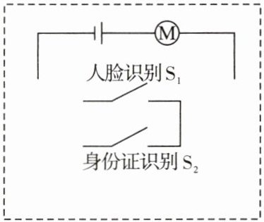 9. (河南南阳期中)小刚在邓州东站乘坐高铁时发现,进站时需要刷身份证进站,闸机口通过人脸识别系统确保“人脸”和“身份证”一致,闸门才会打开通行。人脸识别通过时,开关$S_{1}$闭合;身份证识别通过时,开关$S_{2}$闭合;M表示闸门,请结合图中给出的电路元器件,在虚线框内将电路图补充完整。