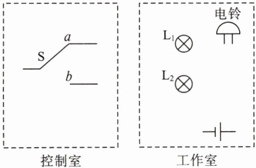 8. (山东青岛崂山区期末)设计一个控制室和工作室的呼叫电路。要求:单刀双掷开关S接a点时,灯$L_{1}$和电铃工作,S接b点时,灯$L_{2}$和电铃工作。请在图中连线,形成符合要求的完整电路图。