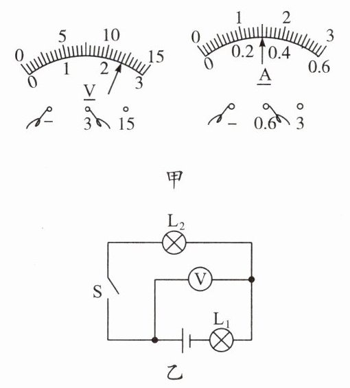 8. (黑龙江鸡西虎林市校级期末)如图甲所示,电压表与电流表的示数分别是
