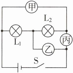 9. 如图所示,开关S闭合后$,L_1、$$L_2$两盏灯均发光,甲、乙、丙是三个电表,请填出甲、乙、丙分别是电流表还是电压表:
