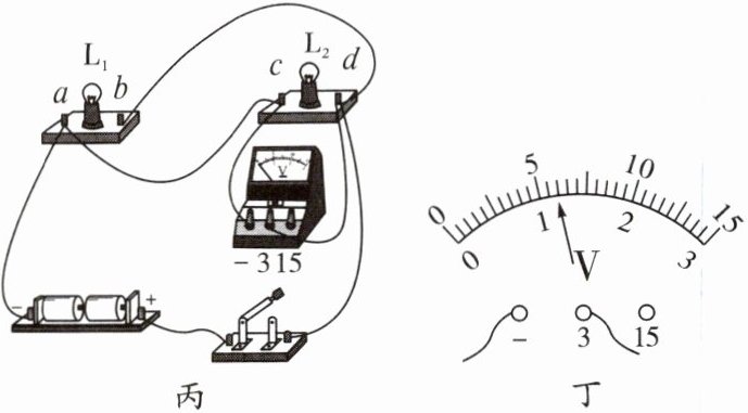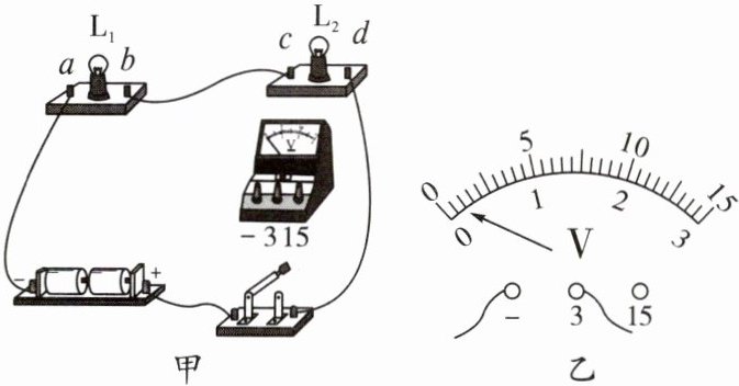 (2)图甲中在测量$L_1$两端电压时,闭合开关前电压表如图乙所示,其原因是电压表______;处理好问题后闭合开关,发现两灯均不亮,电压表指针明显偏转,如果是灯泡发生了故障,则故障原因可能是______,排除故障后,用电压表分别测ab、cd、ad间的电压,每次拆接电压表时,开关应处于______状态;