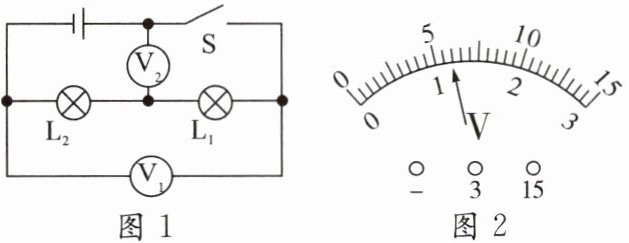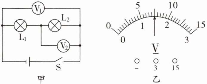 9. 小明按图甲所示的电路进行实验,当闭合开关时,用电器正常工作,电压表$V_1$和$V_2$的指针完全一样,如图乙所示,则电源电压和灯$L_1$两端的电压分别为(