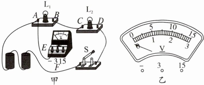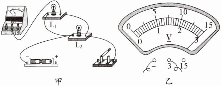 (4)排除故障后,用电压表分别测量小灯泡 $ L_1 $、$ L_2 $ 及电源两端的电压,电压表示数均如图乙所示,为____V。更换不同规格的小灯泡多次测量,发现电压表示数均如图乙所示。由此得出结论:并联电路中各支路用电器两端的电压与电源电压____。