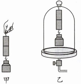 15. (科学思维)用力将端面已锉平的两块铅柱紧压在一起,然后将它们悬挂起来,并在下方挂一重物,发现两铅柱不分开(如图甲所示)。对此现象,小金有疑惑:两铅柱不分开的原因是大气压力造成还是其他引力造成?于是小金将图甲所示的铅柱与重物固定在一个玻璃钟罩内(如图乙所示),逐渐抽出钟罩内的空气。