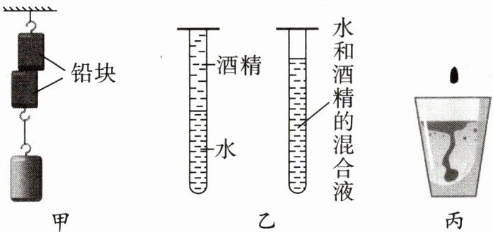 (1)如图甲所示,将两个底面干净、平整的铅块紧压在一起,两个铅块就会结合在一起,下面吊一个较重的物体也不会将它们拉开。这说明分子间存在