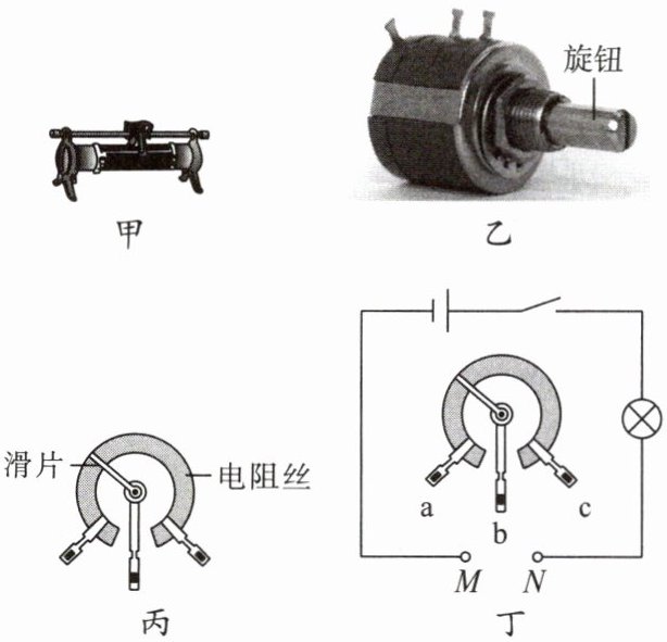 来改变接入电路中电阻大小的。(2)学习完“练习使用滑动变阻器”后,该同学从网上买了一个合适规格的电位器,准备制作一个简易的调光台灯。如图丁所示,若要使旋钮顺时针转动时台灯变亮,则应将电位器的