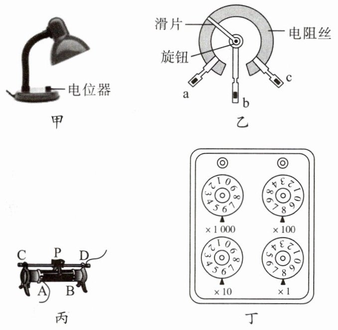 bc AP 6868 [若顺时针旋转旋钮时灯泡发光变亮,即顺时针旋转旋钮时电位器阻值变小,则将bc接线柱接入电路;图丙是某一滑动变阻器,接线柱A、D接入电路,此时接入电路的有效电阻丝为AP;图丁中电阻箱的示数为R=6000Ω+800Ω+60Ω+8Ω=6868Ω。]