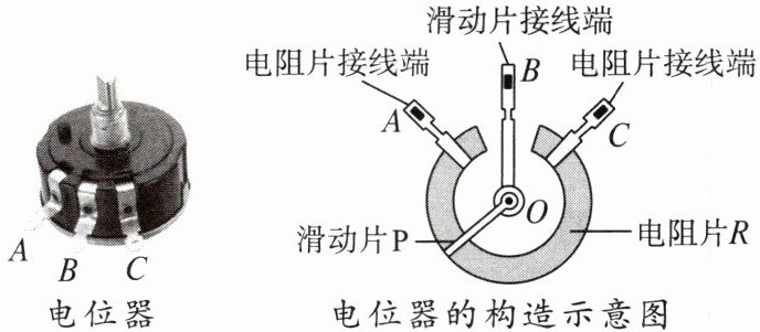 如图是电位器的结构示意图,电阻片R的两端分别与接线端A、C相连,滑动片P的一端通过转轴O与接线端B相连,另一端与电阻片R接触良好,并能绕转轴O在电阻片R上滑动。
