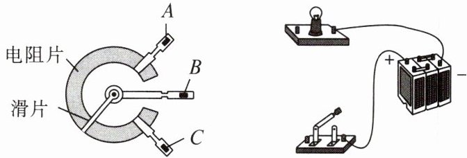 (6)电位器在变阻过程,电阻片的材料不变,横截面积不变,改变的是长度。顺时针旋转滑片时,灯泡变暗,即电位器接入电路的阻值变大,电路中的电流变小,所以应将B、C两个接线端接入电路。作图如下: