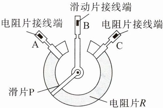 (选填“有效长度”“粗细”或“材料”)改变电阻,从而改变电路中的电流。$A$、$B$、$C$为它的三个接线柱,$P$为旋钮滑片。若将它放入电路,顺时针旋转旋钮能使灯泡的灯光变亮,则应将A、B