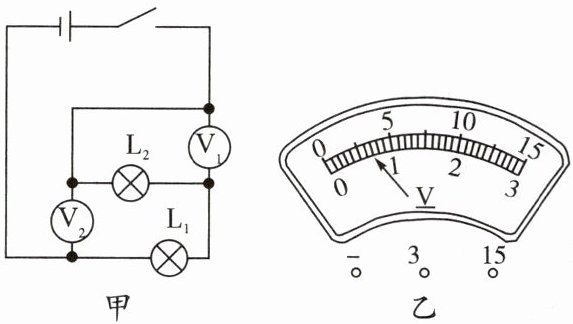 5. (河北沧州期中)如图甲所示电路中,当闭合开关后,两个电压表$V_{1}$、$V_{2}$的指针偏转均为图乙所示,则灯泡$L_{1}和L_{2}$两端的电压分别为(