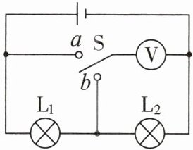 C [开关S接到a时,电压表直接和电源并联,电源电压即为电压表的示数为15V,故A错误;当开关接到b时,两灯泡串联,电压表测$L_{2}$两端的电压,即灯$L_{2}$两端的电压$U_{2}$为4V,故B错误;两灯泡串联,灯$L_{2}$两端的电压$U_{2}$为4V,串联电路中总电压等于各用电器两端电压之和,所以$L_{1}$两端电压为$U_{1}=U - U_{2}=15V - 4V=11V$,故C正确;开关S接到b时,$L_{1}$、$L_{2}$串联,故D错误。故选C。]