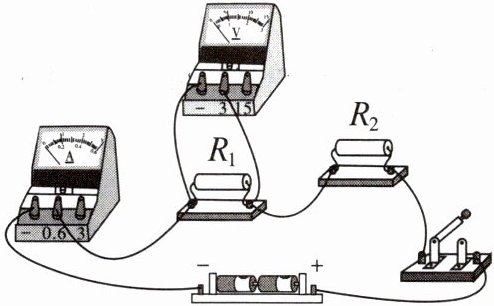 2. (河北邢台校级期中)如图所示实物电路中,电源由两节新干电池串联而成,$ R_{1} $和 $ R_{2} $ 为定值电阻。当开关闭合后,电压表和电流表的示数分别为 $ 2 \, V $ 和 $ 0.2 \, A $,则 $ R_{2} $ 的阻值为
