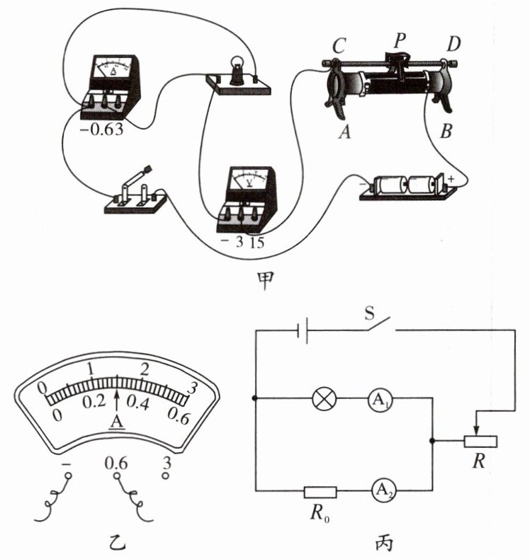 (6) 在测量正常发光时电压为 $ 2.5 \, V $ 的小灯泡的电阻时, 由于电压表损坏, 他多领了一个电流表和已知阻值为 $ R_0 $ 的定值电阻, 设计了如图丙所示的电路进行测量: