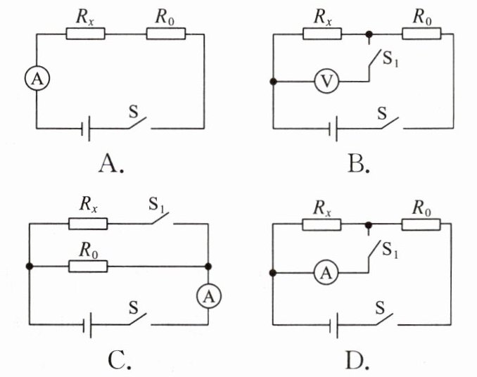 1. (北京通州区期中)在测量未知电阻 $ R_x $ 阻值的实验中, 提供的实验器材有: 稳压电源 (电压未知)、电流表、电压表、阻值已知的定值电阻 $ R_0 $ 等。现有下图所示的几种测量电路, 在不拆改电路的前提下, 能够测量出待测电阻 $ R_x $ 阻值的电路是 (