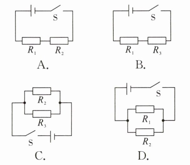 6. (河北石家庄阶段练习)有 $ R_{1} $、$ R_{2} $ 和 $ R_{3} $ 三只定值电阻,已知 $ R_{1}>R_{2}>R_{3} $,分别连接在同一个电源两端。若使通过电源的电流最大,则电阻的连接方式是(