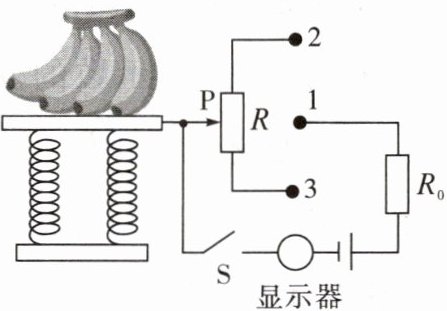 3. 如图是某水果店使用的电子秤工作原理简化图,滑片 $ P $ 可在竖直放置的电阻 $ R $ 上滑动,不放水果时,$ P $ 处于 $ R $ 的最上端。当所称水果的质量增大时,由电表改装成的显示器示数也增大。下列说法不正确的是(