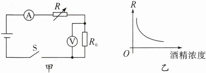 9. 喝酒不开车,开车不喝酒。酒驾危害公共安全,我国已经立法禁止。如图甲是酒精浓度监测仪电路的原理图,电源电压不变,R₀为定值电阻,R为酒精气体传感器,R的阻值与酒精浓度的关系如图乙所示。接通电源,呼出的酒精浓度变大,则电流表示数