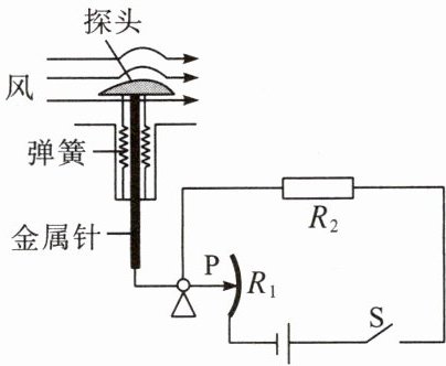 10. 如图所示是小明自制的一种测定风速的装置。当有风吹过探头时,由于探头上、下表面空气流速不同,产生上下表面的压强差,探头带动杠杆转动,使得滑片P移动。当风速减小时,在弹簧的作用下,滑片P向
