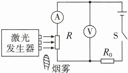 8. (山东聊城中考)如图所示,是列车上烟雾报警器的简化原理图。内装有一个激光发生器及带有一光敏电阻R的电路,其中电源电压恒定,R₀为定值电阻。有烟雾产生时,激光被烟雾遮挡而使光敏电阻的阻值发生变化,从而改变电路中的电流。当电路中的电流增大至某一数值时报警器开始报警。下列说法正确的是(