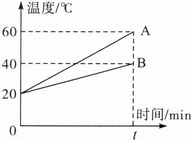 4.D[由于A、B两种液体质量相等,初温相同,用相同的加热器加热相同的时间t min,表示A、B吸收的热量相同,A温度升高了$\Delta t_{A}=60^{\circ}C-20^{\circ}C=40^{\circ}C$,B温度升高了$\Delta t_{B}=40^{\circ}C-$$20^{\circ}C=20^{\circ}C$,$m_{A}:m_{B}=1:1$,$Q_{A}:Q_{B}=1:1$,$\Delta t_{A}:\Delta t_{B}=$$40^{\circ}C:20^{\circ}C=2:1$,根据$Q_{吸}=cm\Delta t$可得,A与B的比热容之比$c_{A}:c_{B}=\frac{Q_{A}}{m\Delta t_{A}}:\frac{Q_{B}}{m\Delta t_{B}}=\frac{Q_{A}}{Q_{B}}×\frac{m\Delta t_{B}}{m\Delta t_{A}}=\frac{1}{1}×\frac{1}{2}=1:2$,故AB错误;用相同的加热器加热相同的时间t min,表示A、B吸收的热量相同,故C错误;由于A、B两种液体质量相等,初温相同,当A、B升高相同的温度,B的比热容大,吸收的热量$Q_{吸B}=$$c_{B}m_{B}\Delta t_{B}$,则A和B升高相同的温度,B吸收热量较多,故D正确。]