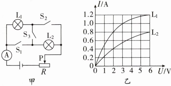 8. 如图甲所示电路,电源电压可调,$ R $为标有“$ 1 A $”字样的滑动变阻器,电流表测量范围为$ 0 ~ 3 A $,$ L_1 $、$ L_2 是额定电压均为 6 V $的小灯泡,其电流与电压的关系如图乙所示。求: