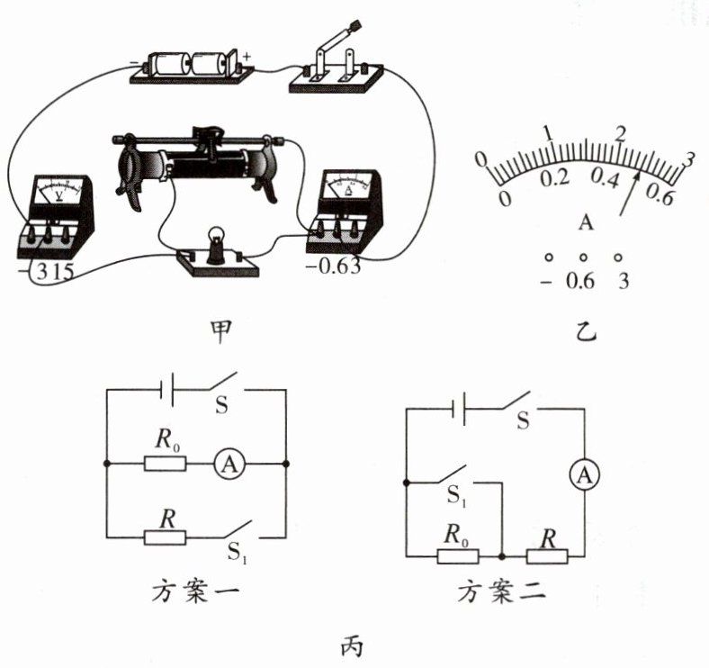 (5)爱探究的小亮对实验进行了拓展,已知电阻$ R_0 $,他设计了如图丙所示的两种方案测定值电阻$ R $的阻值,请你评估分析两种方案中可行的是方案____;利用可行的方案,他的实验操作如下: