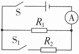 (1)当开关S闭合、S₁断开时,电路为R₁的简单电路,电流表测电路中的电流,R₁两端的电压等于电源电压,此时电路电流为I₁=0.2 A;当开关S、S₁都闭合时,两电阻并联,电流表测的是干路电流,两电阻两端的电压都等于电源电压,此时通过R₁的电流等于I₁,通过R₂的电流I₂=I-I₁=0.5 A-0.2 A=0.3 A;