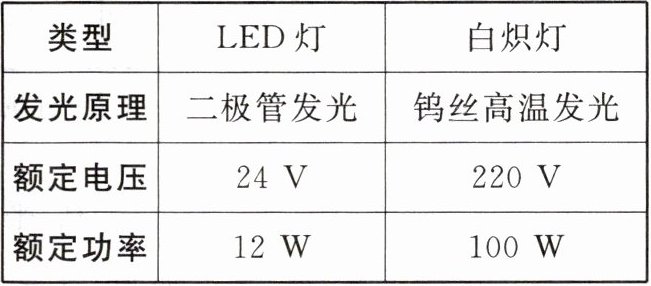 5. (黑龙江哈尔滨平房区期末)小明在实验室中利用仪器测量发现某 LED 灯和白炽灯在正常工作时,两灯的亮度相同。如表所示为该 LED 灯和白炽灯的部分参数。下列说法中正确的是(