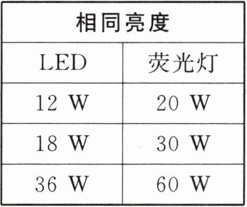 能转化为光能。如图和表是额定电压为 220 V 的某品牌 LED 灯与荧光灯的对比广告图。若广告属实,将一个额定功率为 40 W 的荧光灯替换成亮度相同的 LED 灯,LED 灯的功率为24