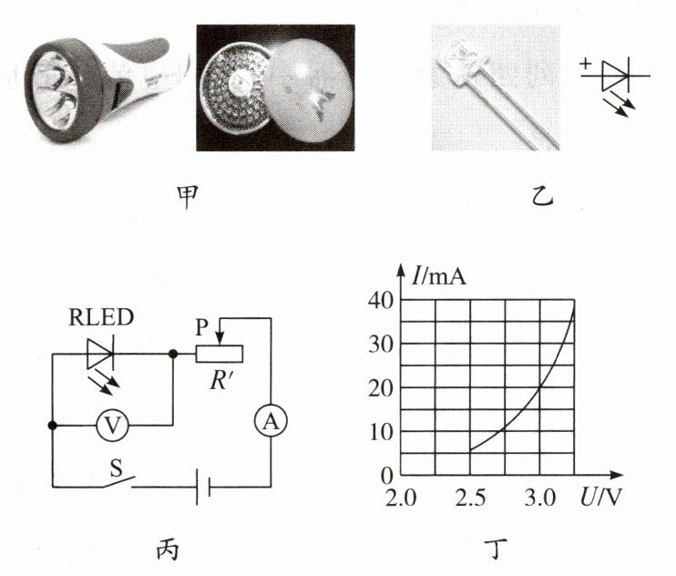 由于二极管具有单向导电性,使用时必须将它的正极与电源正极相连,二极管才能处于导通状态,否则处于截止状态。利用图丙所示电路可以研究发光二极管的工作特性,把一个正常工作电压为 3 V 的 LED 灯接入电源电压恒为 4.5 V 的电路,闭合开关,即处于导通状态,调节变阻器滑片,改变两端的电压和电路中电流,记录多组电压、电流数据,可以得到电压表与电流表示数关系,如图丁所示。