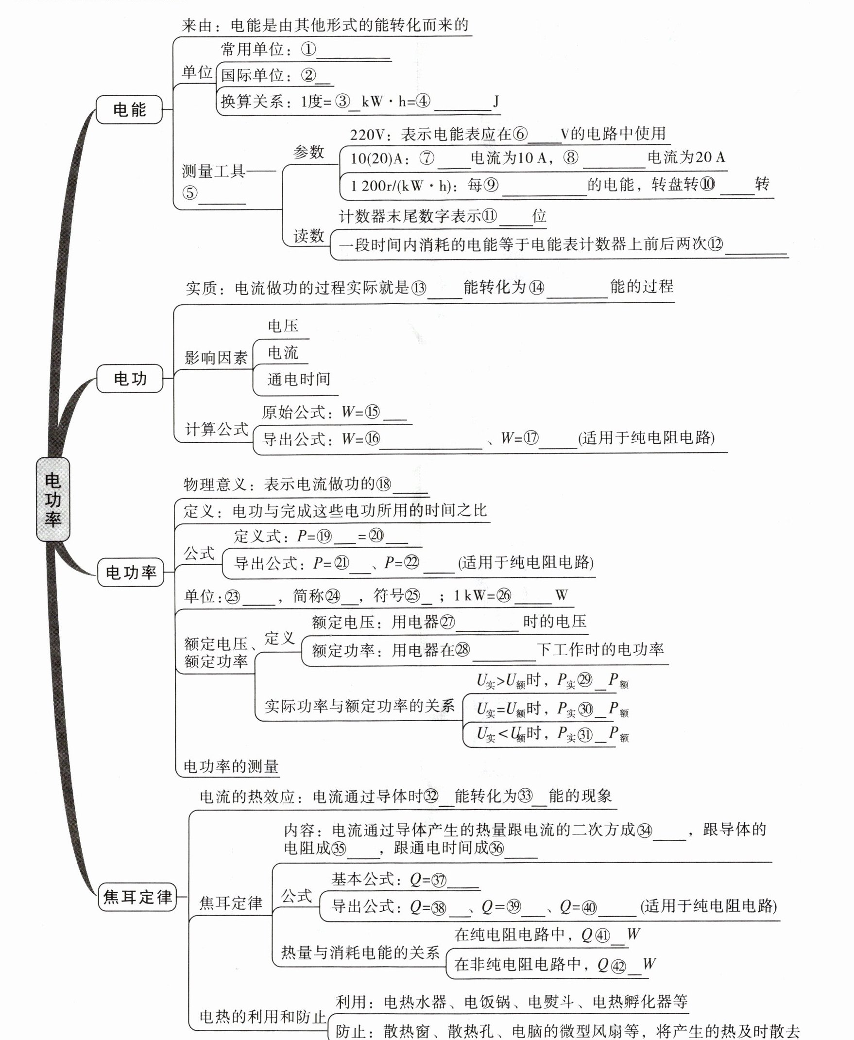 ①度(kW·h) ②J ③1 ④$3.6× 10^{6}$ ⑤电能表 ⑥220 ⑦标定 ⑧额定最大 ⑨消耗1kW·h ⑩1200 ⑪小数 ⑫示数之差 ⑬电 ⑭其他形式 ⑮$UIt$ ⑯$I^{2}Rt$ ⑰$\frac{U^{2}t}{R}$ ⑱快慢 ⑲$\frac{W}{t}$ ⑳$UI$ ㉑$I^{2}R$ ㉒$\frac{U^{2}}{R}$ ㉓瓦特 ㉔瓦 ㉕W ㉖$10^{3}$ ㉗正常工作 ㉘额定电压 ㉙> ㉚= ㉛< ㉜电 ㉝内 ㉞正比 ㉟正比 ㊱正比 ㊲$I^{2}Rt$ ㊳$Pt$ ㊴$UIt$ ㊵$\frac{U^{2}t}{R}$ ㊶= ㊷<