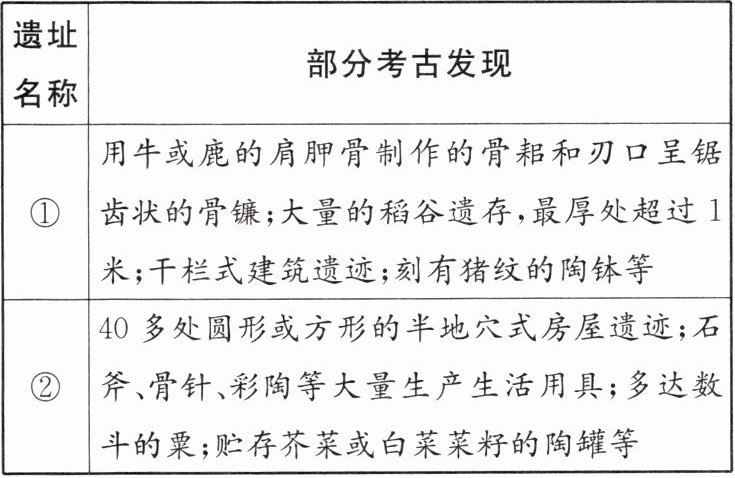 (3)①河姆渡遗址;②半坡遗址。共同点:使用磨制石器;种植农作物;建造房屋;制作陶器;等等。
