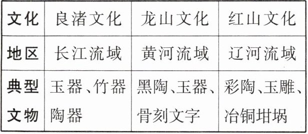 C [据表格可知,长江流域、黄河流域、辽河流域分别出现良渚文化、龙山文化和红山文化,这些文化的典型器物都有玉器、陶器,这说明中国早期文明虽然产生于不同地域,但是却有着一定的相似性和内在统一性,这体现了中华文明多元一体的特点。]