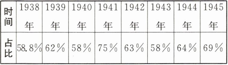 9.D [根据材料“中国共产党领导的人民武装抗击日军所侵占日军总数比例表”及所学知识可知,中国共产党领导的八路军、新四军等抗日武装力量挺进敌后,将敌人的后方变成抗日的前线,到1940年,在华北、华中、华南和东北地区创建了有1亿多人口的抗日根据地和游击区,牵制和抗击了大量日军和伪军。根据地成为敌后游击战得以坚持并取得最后胜利的基地,中国共产党在全民族抗战中发挥了中流砥柱的作用。]