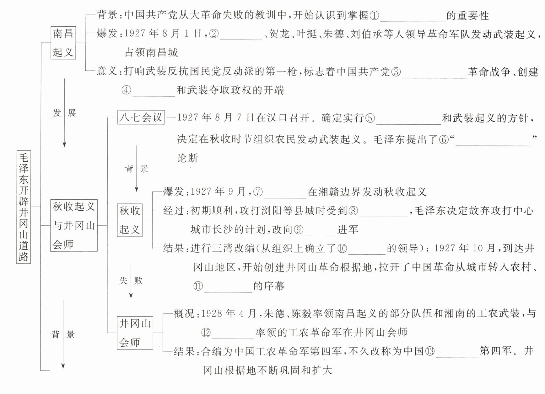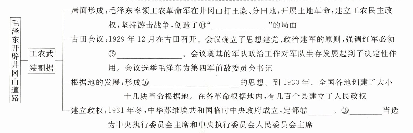 ①革命武装力量 ②周恩来 ③独立领导 ④人民军队 ⑤土地革命 ⑥政权是由枪杆子中取得的 ⑦毛泽东 ⑧严重挫折 ⑨山区 ⑩党对军队 ⑪建立根据地 ⑫毛泽东 ⑬工农红军 ⑭工农武装割据 ⑮绝对服从党的领导 ⑯农村包围城市、武装夺取政权 ⑰瑞金 ⑱毛泽东