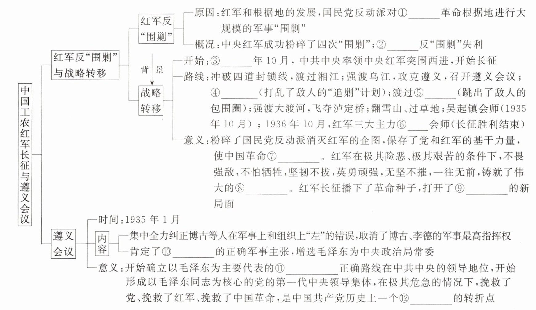 ①中央 ②第五次 ③1934 ④四渡赤水 ⑤金沙江 ⑥会宁 ⑦转危为安 ⑧长征精神 ⑨中国革命 ⑩毛泽东 ⑪马克思主义 ⑫生死攸关