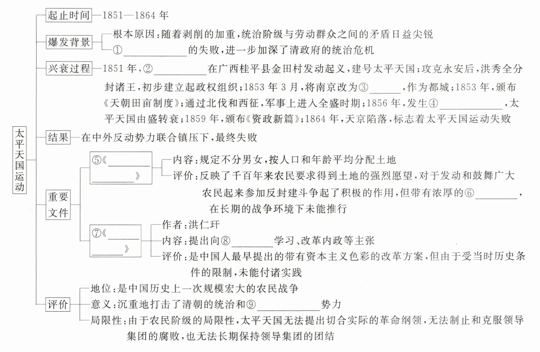 ①鸦片战争 ②洪秀全 ③天京 ④天京事变 ⑤天朝田亩制度 ⑥空想色彩 ⑦资政新篇 ⑧西方 ⑨外国侵略