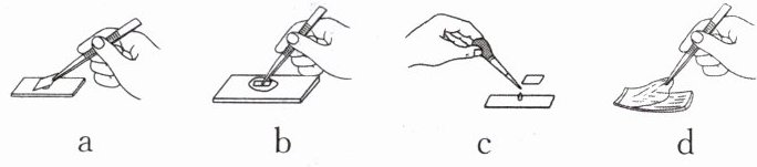D [步骤b是展,可以防止细胞重叠,有利于观察,A正确。步骤a是盖,让盖玻片一边先接触载玻片上的水滴,然后缓缓放下,以免产生气泡,盖玻片操作不当时,装片易产生气泡,B正确。步骤c是滴,洋葱是植物细胞,有细胞壁,滴加清水的目的是维持细胞的原有形状,C正确。制作洋葱鳞片叶内表皮细胞临时装片的正确步骤是擦→c滴清水→d取材→b将表皮展平→a盖盖玻片→染和吸,D错误。]