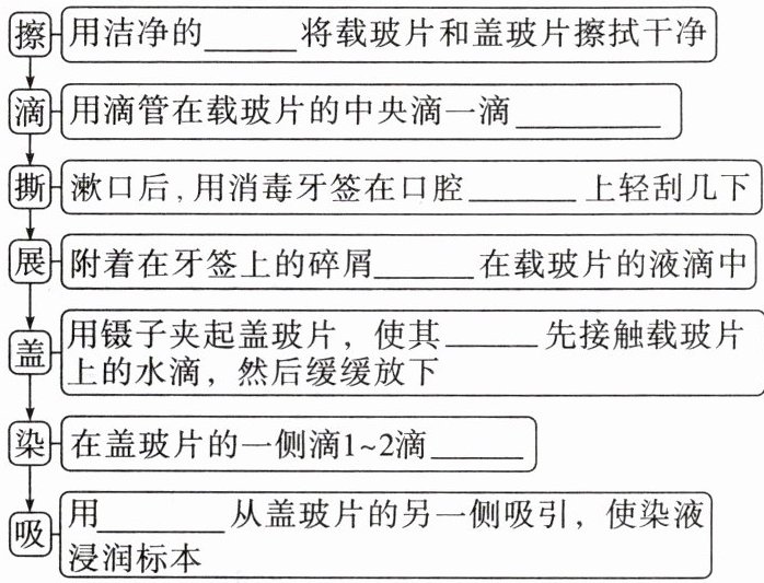 ①用镊子缓慢地盖上玻片 ②在载玻片中央滴一滴生理盐水 ③用消毒牙签在口腔内侧壁上轻轻刮几下 ④擦净载玻片和盖玻片 ⑤将所取材料均匀涂在生理盐水中央 ⑥染色,用吸水纸吸引