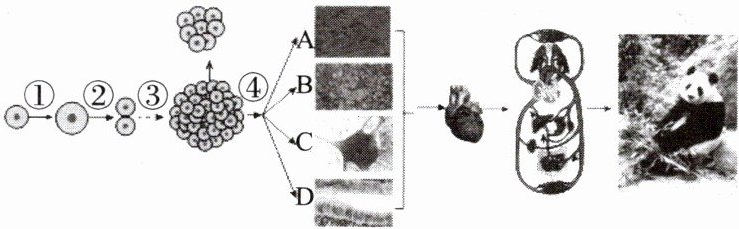 12. (河北唐山路北区期中)大熊猫已经在地球上生存了至少800万年,被誉为“活化石”和“中国国宝”。大熊猫繁育难,在人工饲养条件下尤其难。如图为大熊猫从一个细胞生长发育到成体的过程,请据图回答下列问题。