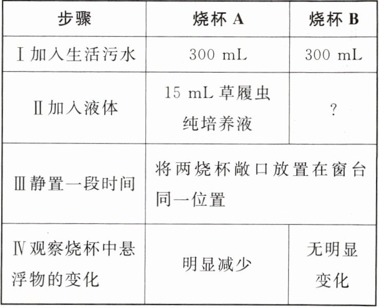 (2) 为了研究草履虫是否可以净化水质,同学们收集了生活污水,摇匀后分别放入两个烧杯,处理步骤如下表所示。