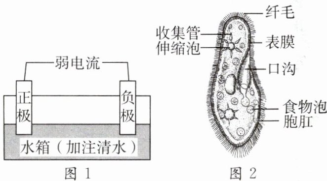 ② 取水样滴入图1装置的______(填“正极”或“负极”)一侧。草履虫依靠纤毛的摆动,几分钟后到达水箱另一侧。用滴管吸取无杂质的草履虫,注入培养液中培养备用。生活在水中的草履虫不会因为吸水而涨破,这与图2中能排出细胞内多余水分的收集管和______有关。